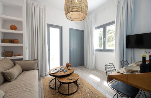 Hestia is a beautifully furnished apartment, with quality materials and natural tones, 1 minute walk from the sandy beaches of Agio Prokopios.