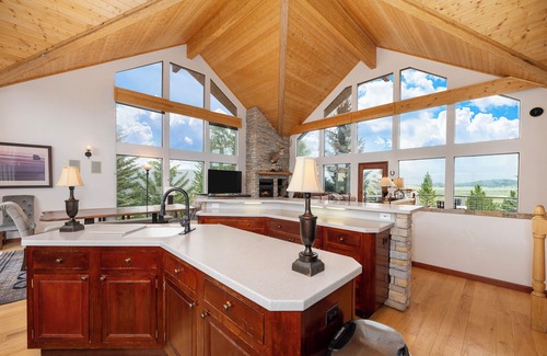 The inviting living room features cozy leather sofas, rustic lighting, a fireplace, floor-to-ceiling windows, vaulted ceilings, and a large Smart/Direct TV—perfect for movie nights or catching up with friends. The kitchen, connected to the dining area, boasts a spacious dining table and additional bar seating, with an extra sink to streamline meal preparation.