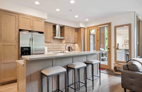 This Platinum, first floor, ski-in, ski-out/on-mountain residence offers a wood burning fireplace, a full kitchen, three guest suites – each with an attached bathroom – one with a king bed, the other two have two twin beds, plus a sleeper sofa in the den. Additional features include custom lighting, a washer/dryer, garage parking for one vehicle and access to a ski locker with boot heater.