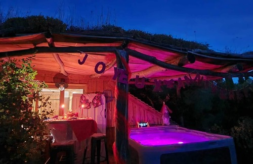 Les Cabanes Trésors de Campagne are unusual accommodation with private spa located on an agro-ecological domain surrounded by nature, near Carcassonne and Limoux. Their construction is entirely artisanal with a large gangway terrace and a wooden heel roof for the Cabin on stilts of the Wild Berries. The Hobbit House is partially buried and the roof is being revegetated. Some tree trunks come from our oak forest and the furniture is inspired by the Magic of the World of the Lords of the Rings. The splendid 360 ° view of the Pyrenees and the mosaic of landscapes, forests, meadows and vineyards is breathtaking. You will find all the comfort and calm necessary for an authentic stay, a romantic night, a Gourmet weekend or Nature. Unlimited spa, of course!