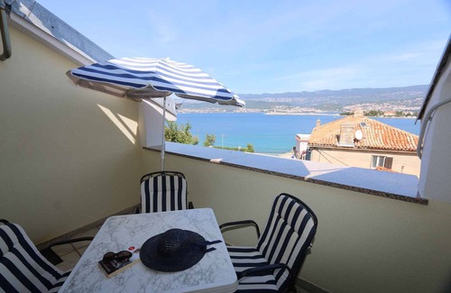 The holiday apartment is located in an apartment house, was renovated in 2000 and is furnished in a functional style. The property is located in a busy environment, in the town centre. Also due to the view over the sea from the property and its location at the water the domicile is popular. Available for use: barbecue facilities and garden furniture.LocationŠilo, district Šilo. The holiday apartement is located on a open plot. The landlord lives only occasionally in the house. Access is directly from the main road. Parking (for 1 car) is available on the property. Specialair conditioning.Facilities: internet access (WLAN). TV reception takes place via satellite. Dogsnot allowed. DistancesShopping 50 m, restaurant 100 m, town center 50 m. Malinska: bank 15 km and discotheque 15 km. cinema in River 50 km. Šilo: pharmacy 50 m and doctor 500 m. Main road 5 m. In summer: Adriatic Sea 70 m in Šilo (beach 70 m in Šilo featuring gravel and bathing plateaus). Šilo: fishing, diving each 100 m. boat launch 1000 m, dog beach 1300 m and boat rental 70 m. DivisionHoliday apartment, 1 floor, 2 rooms (including 1 bedroom), 40 sqm, in total 3 beds (including 1 additional bed). RoomThe entrance to your holiday apartment is located on the 2nd floor and leads over an internal staircase and an external staircase directly into the kitchen-diner. Living room (walk-through room) with 1 additional bed on couch/sofa, sitting area, TV, dining area (4 seats) and access to the balcony (8 sqm, garden furniture). Bedroom with 1 double bed. Cooking nook in the living room with gas stove (2 flames), electric stove (2 plates), oven, fridge (icebox) and coffee machine. Bathroom with shower, 1 washbasin and WC. Terms of lease and pricesIncluded in the priceinternet access, dish towels, air conditioning, parking place, electricity, gas, water, final cleaning, bed linen, Wireless Internet access. Side costs-Additionally(Payable when booking)/additonal fee for short-term stays (less than 4 nights) obligatory 30% per stay. local tax.Costs on the spot:/Obligatory:registration fee 4 € per person per stay.Deposit:EUR 150,-/object