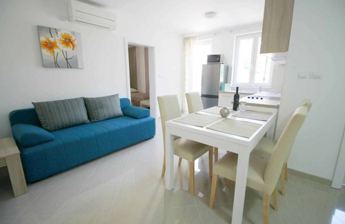 The holiday apartment is located in an apartment house built in 2015 and is furnished in a modern style. The property is located in a residential area. Available for shared use: sun lounger, garden shower, barbecue facilities, terrace and garden furniture.LocationBaška. The landlord does not live in the house or on the property. Access is via a side road (asphalted). Parking (for 1 car) is available on the property. Specialair conditioning.Facilities: internet access (WLAN) and safe. TV reception takes place via satellite. PoolAll pools are available for shared use. Outdoor pool (usable from early May to mid October, 4 m x 8 m, depth 1.4 m). Dogsnot allowed. DistancesShopping 100 m, restaurant 150 m, town center 100 m. The nearest public transport stop is 700 m away. pharmacy, bank each 100 m. discotheque in 11,7 km. sauna in 15,2 km. airport in 22,5 km. cinema in 23,8 km. doctor in 300 m. railway station in Rijeka 75 km. Children's playground 400 m. In summer: Adriatic Sea 200 m in Baška (beach 200 m in Baška featuring gravel). diving in Baška 900 m. The beach is suitable for children and non-swimmers DivisionHoliday apartment, 1 floor, 3 rooms (including 2 bedrooms), 55 sqm, in total 4 beds. RoomThe entrance to your holiday apartment is located on the ground floor. Living room (walk-through room) with TV and access to the terrace (16 sqm, garden furniture). Bedroom with 2 single beds. Bedroom with 1 double bed. Kitchen with dining area (5 seats), electric stove (4 plates), extractor hood, dishwasher, fridge (icebox), microwave, coffee machine and electric kettle. Bathroom with shower, WC and hairdryer. Terms of lease and pricesIncluded in the priceOutdoor pool, internet access, dish towels, air conditioning, parking place, safe, electricity, water, final cleaning, bed linen, hand towels, pool, Bed linen (weekly change), hand towels (weekly change), Wireless Internet access. Side costs-Additionally(Payable when booking)/additonal fee for short-term stays (less than 4 nights) obligatory 30% per stay.Costs on the spot:/Obligatory:registration fee 5 € per person per stay. local tax by local tariff.Deposit:No deposit.