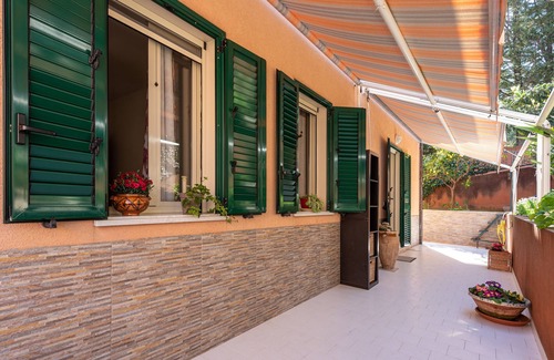 The private outdoor area offers a garden and an open terrace, ideal for enjoying the outdoors. Public transport connections are within easy walking distance. The apartment is just 400 meters from the beach, accessible via stairs.