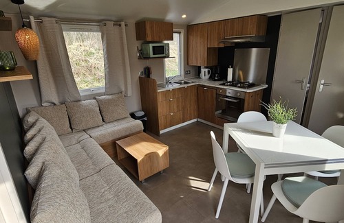 The new chalet offers a living area of about 31m². This modern mobile home has 2 bedrooms, a bedroom with a double bed with gel foam topper measuring 160 x 200 cm and a children's room with two single beds measuring 80 x 190 cm, each equipped with wardrobes.