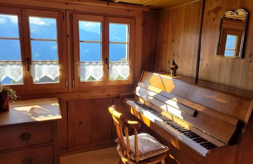 The Mu-(sik)heim holiday home is situated at 1,100 metres above sea level on the Haldi sun terrace in the heart of primeval Switzerland. Surrounded by imposing mountains and nestled in lush meadows, you can experience the Swiss mountains up close. If you are on holiday here, you can obtain a driving permit from the municipality for a fee. Otherwise, locals and tourists take the cable car to Haldi. This is probably one of the reasons why the area is a quiet oasis for people who want to escape the hustle and bustle of everyday life. Here you will find various places of power for quiet contemplation, numerous walking and hiking opportunities through forests, fields, alpine meadows with marvellously fragrant and beautiful alpine flowers up to the mountain peaks and rocky paths. A piano allows musicians to practise or compose to their heart's content. In winter, various snowshoe routes invite you to go on day or full moon and star hikes. The romantic toboggan run into the valley and the nearby family ski lift are also popular.