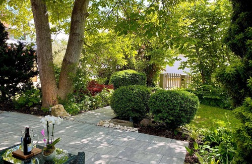 approx. 400 sqm private garden, completely fenced except for the open driveway, three car parking spaces, beautifully ingrown garden with mature trees