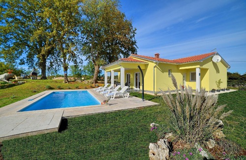 Romantic villa with private pool near PulaVilla Paradiso in Matelići, Marcana's Riviera is the perfect location for those who want to enjoy a carefree holiday, surrounded by green nature in a quiet location. The seen of the sunset at the pool will be the answer to the question why it is named Paradiso.At the holiday home Paradiso your children can play undisturbed at the pool, trampoline, volley ball or football while you can prepare the outside dinner with the grill. The interiors of the house are well-equipped with a modern style The two bedrooms have each it's own bathroom with shower . You can relax on the large terrace and enjoy with your family the summer heat. Those who are interested in an active holiday can visit the horse riding center of Barba Tone in Manjadvorci or the Adrenalin Park in Glavani. The nearest beach is located in the place Krnicki Port, Rakalj as well as in the tourist resort of Duga Uvala. LGBTQ people are welcome.