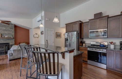 **Inside, Comfort Meets Elegance:** Step through the main entrance to find a well-appointed entryway with ample storage, leading into a spacious, open-plan living area. The heart of the cabin is its living, dining, and kitchen area, featuring a cozy wood-burning stove (firewood provided), ductless heat and air conditioning for year-round comfort, and a flat-screen monitor for entertainment. The dining area comfortably seats six, perfect for family meals, while the kitchen boasts marble countertops, an island workstation and breakfast bar, all-new Whirlpool stainless steel appliances, setting the stage for your culinary adventures.