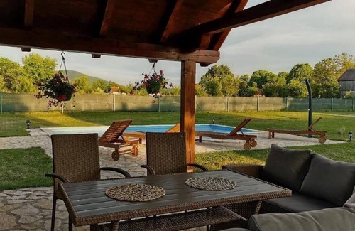 The house has a pool with a deckchairs surrounding with a view on the green hills what is especially nice on the sunset when is full of colours.Near the pool is stone tavern where guests can eat meals prepared on the nice barbacue which is in the yard, also. In the tavern guests can sit inside and outside on the terace, no matter on the weather conditions. It is suistanble for enteretainments.House is suistanble for kids. Kids can enjoy in the big playground with playgrund swings and small wooden house where kids can have fun and play sports like a football.The yard is fanced and guests have own privacy for sunbathing for example. One side of the house is looking on the hills, and on the other side guests can see domestic animals like horses and sweet sheeps which is especially fun for kids.