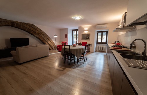 The apartment is located in Corso Cavour in Orvieto, a few steps from the cathedral and not far from the main square. Completely renovated in 2014, is arranged on 2 floors: a large and bright open floor plan with arches on the first floor, with kitchen and balcony overlooking the theater Mancinelli and on the second floor two double bedrooms (one bedroom with king size bed and one with the option of 2 single beds) and a bathroom.