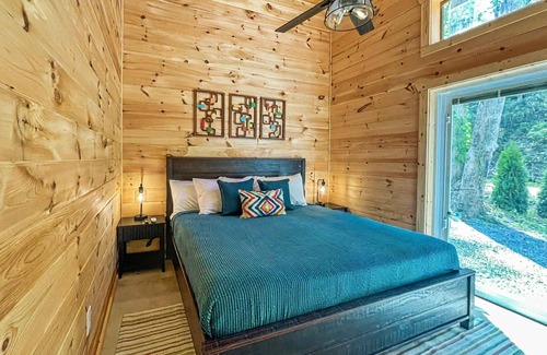 Step inside to a bright, open living area with a fully stocked kitchen and a cozy dining nook. The living room is perfect for unwinding after a day of hiking, with plush seating, an electric fireplace, and a SmartTV for movie nights. The spacious king bedroom connects to a full bathroom and opens to a private patio with a soothing hot tub-ideal for soaking after exploring the Great Smoky Mountains National Park.