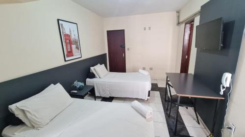 Hotel Cruz has accommodations in Divinópolis. This 3-star hotel offers room service, a 24-hour front desk and free WiFi. The hotel has family rooms. At the hotel, each room has a desk. Complete with a private bathroom equipped with a shower and free toiletries, the rooms at Hotel Cruz have a flat-screen TV and air conditioning, and some rooms have a balcony. At the accommodation rooms come with bed linen and towels. Guests at Hotel Cruz can enjoy a buffet breakfast. The nearest airport is Tancredo Neves International Airport, 96 miles from the hotel.