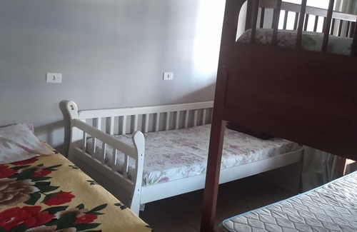 House two bedroom one bedroom has three single beds and two loose mattresses, another bedroom has a double bed and a single bed, a bathroom with shower inside the house, wifi, tv room (Sky Cable tv 200 channels) ). Outside barbecue with grill, kitchen utensils, plate, glasses, pressure cooker, cutlery, gas hob, fridge, two bathrooms outside male and female, illuminated vinyl pool and waterfall, all enclosed house located 3 k from the center of lindoia and there are 3 k from aguas de lindoia quiet place