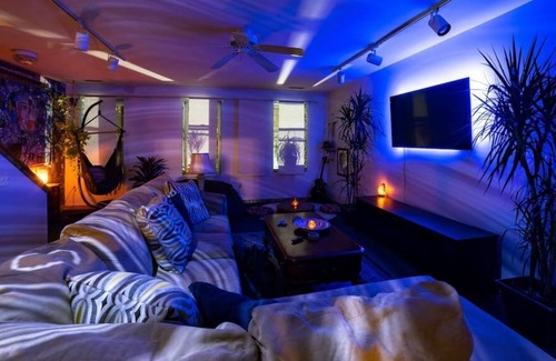 The home is stacked with live plants, mood lighting, artwork, two 55" inch smart TVs, and a disco ball on a motor!