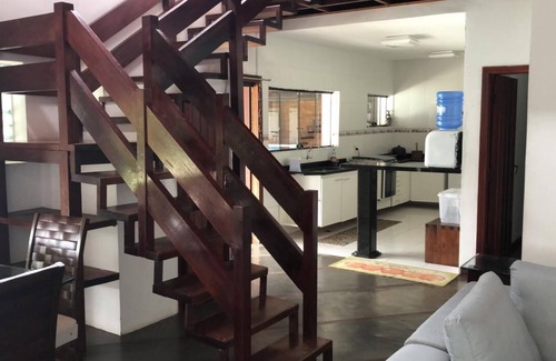 Very comfortable house with 4 suites, star / dining room, full kitchen with 2 refrigerators, oven, microwave, stove, barbecue, 50 m2 party room with barbecue, pizza oven, bar tables. chairs and mezzanine, large pool with waterslide, sape kiosk, large 5-car garage, wifi internet, fans in all rooms, double bed in all rooms, total privacy for you and your family,