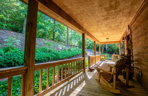 A delightful home with history and a noisy trout stream just outside your door! This two bedroom, three and a half bath home holds 2 bedrooms with king size beds plus a futon in the loft as well as a jetted tub in the master suite and a hot tub for four on the back deck. With three porches - two of them overlooking Brasstown Creek - there are plenty of places outside to enjoy the views and mountain air.