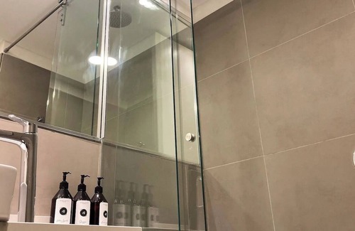 El baño es elegante y cuenta con una ducha de vidrio y amenidades para su comodidad, asegurando que su estancia sea placentera. Además, podrá disfrutar de su café matutino o una copa de vino por la tarde en el balcón, que ofrece vistas a un hermoso parque cercano.