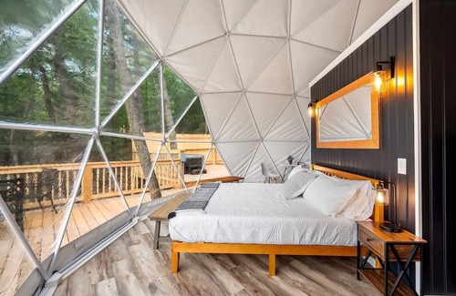 This is a luxe glamping dome with gorgeous mountain views and exceptional amenities. Relax under the stars & explore this unique getaway.