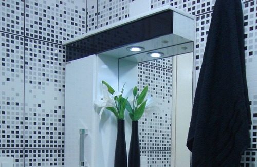 With natural lighting and ventilation, spacious, decorated in shades of white and black, fully tiled in the style pastilled, tiled, leaving the environment very pleasant.