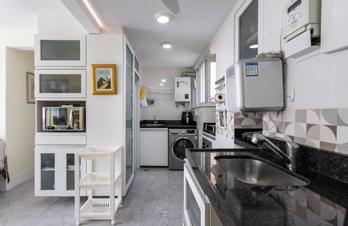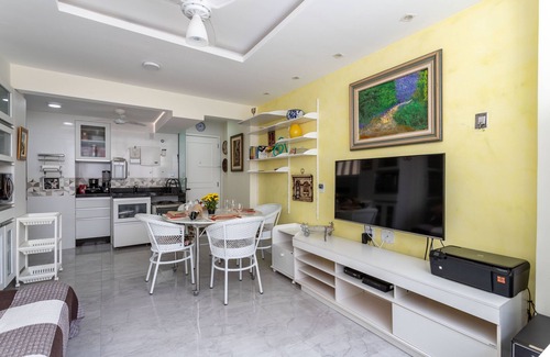 fit 2 rooms on the second floor of the back with 2 elevators, building of 15 floors, 2 apt per floor, distance of 10 m between the apt. Large and well-kept garden at the entrance. Completely renovated, porcelain floors, 2 bathrooms, suite with whirlpool bath, social bathroom with double shower, including high-tech shower with 6 water outlets. Ceiling fan and split air conditioning in the room and the 2 bedrooms. Fully equipped kitchen, including dishwasher, electric cooktop and microwave. Service area with tank and lava and dry clothes. 55 "samsung flat TV in the living room, 32" samsung flat TV in the suite. TV in the social area. WiFi 120 MB and cable tv and netflix