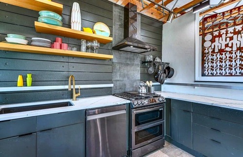 Chef's kitchen with new appliances and a fully stocked pantry. Eco ICCF block casita built in 2023 in an Industrial Modern style appointed with vintage Scandinavian mid-century furniture, polished concrete floors, lime plaster walls, and an exposed 10 ft.+ ceiling of wooden and metal truss beams. Enjoy the luxury Purple Mattress - sleep in ultimate comfort on linen-blend sheets. Smart house features like music inside and out with voice control Amazon Music and touch free lighting. The Bath is a European Style wet bathroom with an additional rain head and hand held that you can take outside to a private walled patio. Two vintage clawfoot soak tubs on a private dramatic overlook available at an additional cost. Please confirm details and availability during the booking process if this is something you would like to enjoy. Only 13 minutes drive into Old Bisbee, Safeway, restaurants, events and a lot more!