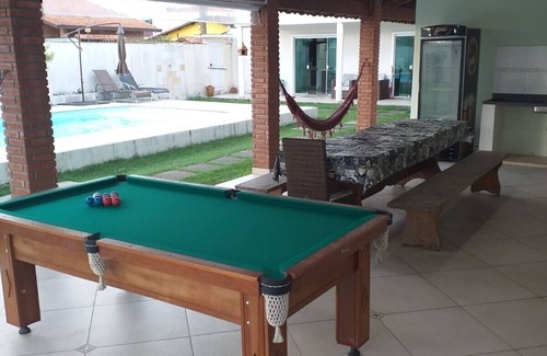 The house has 3 comfortable suites, 5 bathrooms, dining room with good table, living room, games room, kitchen equipped with various appliances, pool with waterfall, exit from the suites to balcony overlooking pool, barbecue shed with large multi-person table, lawn garden, Wi-Fi, closed Sky TV, 49 ”TV, and 32” master suite TV, modern decor, happy days guarantee!