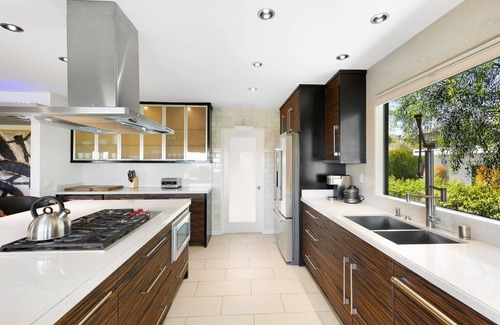 The first living space is upstairs off the entryway of the main house and has 3 bedrooms, 3 bathrooms. Inside the decor is high-style designer chic, and the entire back wall of the upstairs living area is glass, letting in the incredible views of swaying palms and the city below. The great room, dining room and kitchen are all open to each other and the great room features a wall mounted TV, comfortable seating and a fireplace. The dining room has seating for 10. The contemporary kitchen features a large island with bar stools for 3, great counter space and top of the line appliances. Upstairs living also has a full laundry room.