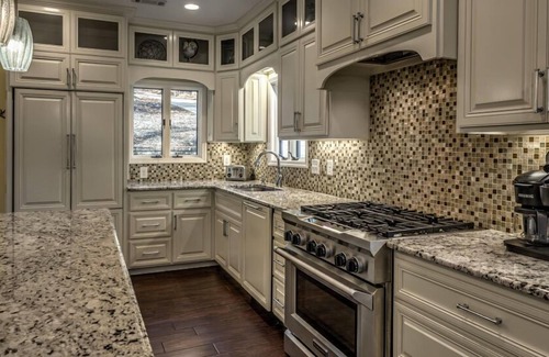 Kitchen - fully equipped main level kitchen, panel ready stainless steel appliances, gas stove, electric oven, custom cabinets, granite countertops, breakfast bar seats 4, kitchen utensils, microwave, toaster, blender, drip coffeemaker (bring basket filters), Keurig,