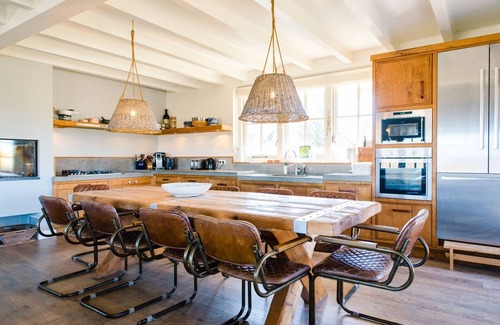 The open kitchen is equipped with every luxury including a convection oven, microwave, 5-burner gas stove, Teppan Yaki plate, 2 dishwashers, large side-by-side fridge/freezer combination and a spacious 10-person dining table made of Ameland beach wood. There is also a fireplace.