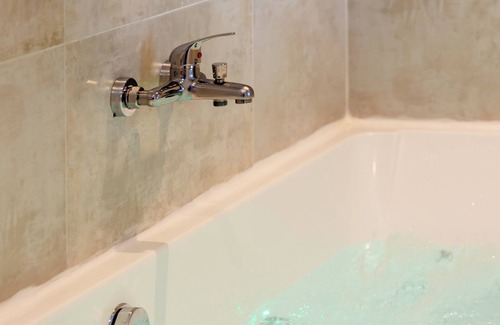 Leave stress behind and treat yourself to a moment of pure pleasure in a 2-person whirlpool bath, ideal for relaxing with a loved one. The bathroom, tastefully decorated with a marble statue, also has a spacious walk-in shower, a vanity unit, and a toilet.