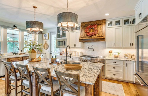 A luxurious lake getaway with plenty of privacy awaits at this Hiawassee vacation rental. Nestled between the trees on the edge of Lake Chatuge, this waterfront 5-bed, 4.5-bath home is packed with indoor and outdoor fun for the whole crew. Whether you’re swimming off of the boat dock, taking in lake and mountain views from the screened porch, or soaking in the hot tub, you’ll find plenty of relaxation at this retreat. Head in to stream a movie on the Smart TV when you’re ready to call it a day.