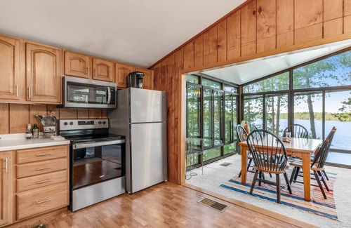 Enjoy the four-season wonders of Wisconsin's beautiful Northwoods at this Eagle River home, boasting sweeping views of Meta Lake directly from the house! This lakefront escape features its very own dock, kayaks that you can take out on the water, and a stunning piece of property where you can watch passing wildlife and enjoy rest and relaxation during your stay. You'll also have use of a full kitchen, a gas grill, and a spacious deck where you can unwind in the summer sun. A large dining area with wrap-around windows throughout offers stunning views of the lake. Stay cool with central air during the hot summer months, or sit back on a brisk winter day in front of the cozy fireplace while watching the blissful snow fall.