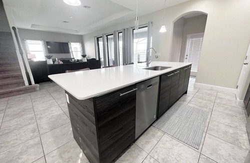 As you enter the home, you are greeted by a large family area and island kitchen with high ceilings, offering a spacious and open layout. The fully-equipped kitchen includes everything you need to prepare meals, and the kitchen bar is perfect for those on-the-go. The family area features a comfortable sleeper sofa, a 46-inch Smart TV, and opens out to your private screened-in patio and pool area with beautiful views of the lake.