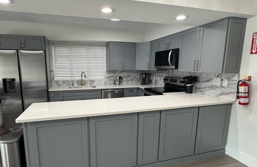 -Full kitchen is equipped with coffee machine, tea kettle, toaster, blender, cookware, glassware, dishwasher, refrigerator, freezer, and microwave.