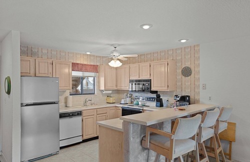 The master bedroom features a king size bed and en suite bathroom with shower. The guest bedroom features two twin beds, however, they can also be pushed together to make a king, as a king size mattress topper is also provided. The guest bathroom features a tub/shower combo. Enjoy a full kitchen, deck overlooking the water and a washer/dryer available for use during your stay.