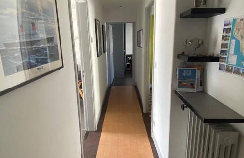 Kitchen (induction hobs, oven, dishwasher, microwave) with dining area, sitting room (comfortable sofa bed 160x200 cm) with TV, 2 bedrooms with 2 single beds (90 cm), 1 shower room with washing machine, separate toilet. Heating and electricity included. Sheets provided. Optional housecleaning service: 40€. Tourist tax. Holiday cottage in the city of Le Havre. Flat located on the 1st floor, opposite the sea, you will have a view of the harbour of Le Havre. City listed a UNESCO World Heritage Site, you will be next to the Malraux Museum and the beach. Art lovers, you will be able to enjoy the modern and personalised decor of the owner (sculpture and painting). Free shared car park behind the building.