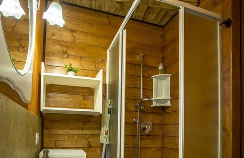 A wooden staircase leads us to the attic where a nice solution offers us a comfortable double bedroom with an original foldaway sliding bed and a large bathroom with tub.