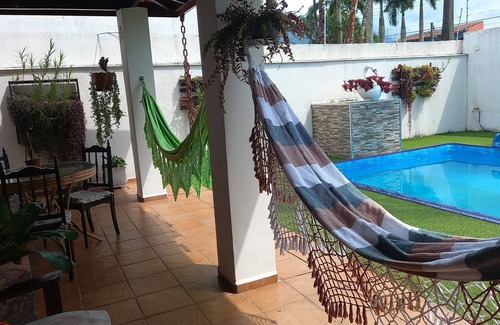 Leisure corner: beach, swimming pool, barbecue, parking spaces, air and trails with waterfall | House in Praia Grande, Brazil