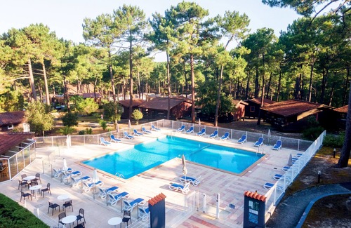 Maubuisson 5 km from Carcans-Plage: Simple holiday village "Les Sentes". 2 km from the centre of Maubuisson, 5 km from the centre of Carcans-Plage, 14 km from the centre of Lacanau-Océan, in a quiet position, 5.5 km from the sea, 2 km from the lake, 2 km from the beach, in the woods. For shared use: swimming pool fenced (140 m2, seasonal availability: 01.Jul. - 31.Aug.). WC in the pool area, outdoor shower, table tennis, boccia, children's playground. In the complex: reception, bar, washing machine, tumble dryer (for shared use, extra). Parking. Shop 2 km, supermarket 11 km, restaurant 2 km, sandy beach "Carcans-Plage" 5.5 km, bathing lake "Maubuisson" 2 km. Golf course (18 hole) 15 km, surf school 5.5 km, sailing school 2 km, walking paths from the house 10 m, cycle lane 50 m. Nearby attractions: Pauillac (route des vins) 40 km, Bordeaux 60 km, Soulac / Cap-Ferret 70 km, Royan (par le bac) 80 km. Please note: car-free holiday complex. Loading and unloading of baggage is possible at the holiday house. The photograph shows a typical example.