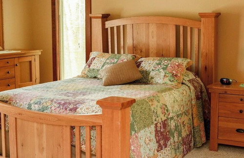 This cedar sided home is available for rent as a 2-10 person rental with the option for single room rentals up to the whole house. We have a Master Bedroom suite with bathroom complete with jacuzzi tub and shower. The suites are available on a one night basis, and they include a small fridge, microwave and coffee pot. The whole house rental includes three queen bedrooms, one twin trundle bedroom, a queen hide-a-bed couch in the living room and two bathrooms, one with jacuzzi and shower, the other with a tub/shower unit.