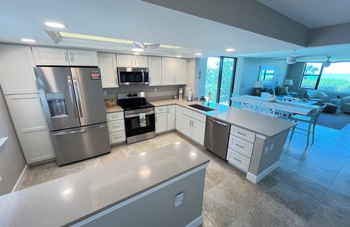 Gulf front & ground level. Our fully equipped condo has been completely remodeled with two bedrooms and two tile shower/bathtubs bathrooms. We know you'll love the beautifully decorated interiors and the beachfront location on the convenient east end of Sanibel Island. The condo is incredibly bright and spacious and sleeps up to 6 people. Loggerhead Cay 501 is on the ground floor of a four- story building. You will have a dedicated parking spot right outside the condos front door.