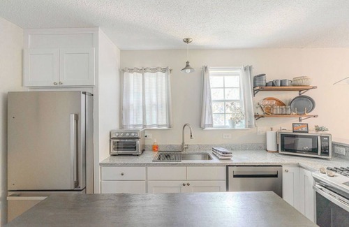 Love Alley cottage is a 1,000 sq. foot home located in downtown Wilmington. Parking is located on the street. Upon arrival, you'll be greeted with a cozy front porch, perfect for morning coffee! The modern living room has impressive upgrades, including a sleek fireplace. Three queen beds allow six guests to sleep comfortably. This listing comes with all the comforts of home- a full kitchen, in-unit laundry, and a fenced-in backyard for pets!
