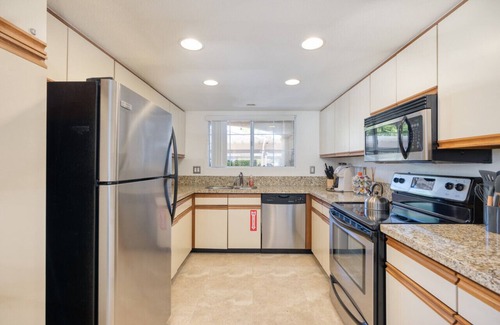 The condo is comfortably furnished with a king sized bed in the primary bedroom, which offers an en-suite bathroom and a full sized bed in the guest bedroom, located next to the second bathroom. With a TV and work space in the master bedroom, the condo is ideal for work from home trips with the family.