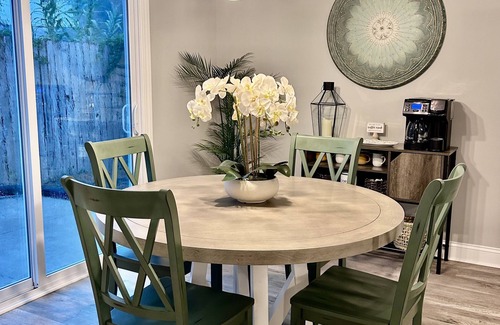 Back Patio Oasis: Step outside to our fully enclosed private back patio oasis surrounded by palm trees. Whether you're enjoying a morning coffee, an evening drink or firing up the Weber charcoal grill, this space is perfect for some outdoor relaxation.