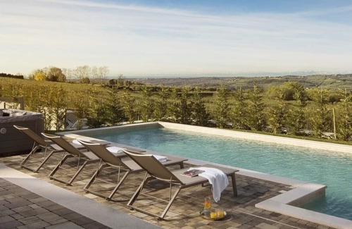 The spacious terrace offers an amazing view of the neighboring vineyards and a dining area with a roof, inviting you to enjoy delicious meals out in the open. The outdoor area promises pure pleasure with a hydromassage swimming pool and loungers around it. There is also a shower next to it as well as an outdoor jacuzzi.