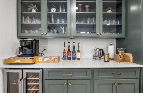 • 👨🍳 Fully stocked with cookware, plates, and utensils for culinary adventures. It features a dedicated coffee & tea bar, wine fridge, air fryer, blenders, and more.