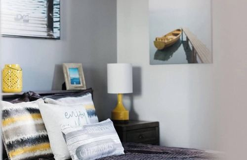 Our Fantastic Modern Decorate Luxurious main level 1 Bdrm Condo with 10-foot Ceiling, walkout patio, one step from the boardwalk. Fully Furnished for your stay located at Beautiful Friday Harbour all Season Resort. One Queen bed. Smart TV, High Speed WiFi, In-Suite Laundry. Private entry from prestige patio. Your perfect getaway less than an hour from Toronto and minutes away from Barrie, golf courses and ski resorts. Friday Harbour has the award-winning golf club, 200 acres of natural landscapes fused with urban amenities. Boat rentals at the Marina. Everything you can dream of are all within the resort. It is the most sought-after one-stop amazing resort in Canada. It has “One11 Beauty Bar “a full-service salon spa offering aesthetic services, full hair services, facials and massage, skin rejuvenation, and body treatments! We have it all. It also offers fantastic dining experience at the Lake Club, Fishbone, Avenue, the Nest Golf Clubhouse, Zaza Cafe, At Essence Health and Juice Bar, Parisienne classic French bakery, Starbucks, Dirty Oar Public House, Pier Bar with Marina views as you enjoy drinks and delicious. Provides great shopping experience at the boardwalk with boutique shops, LCBO, Crock A Doodle pottery painting studio, Sweet Harbour Toys & Candy Co Fine Food Supermarket, Clothing Boutique, ADM design Inc. Etc... Everything is so convenient at the resort. It was not designed to be a place. It was designed to be a destination. It's a place where you can unwind, disconnect & reconnect all your senses with the healing powers of the forest & beautiful sunsets, truly feel relaxed. Whether you come to take in the peaceful serenity of the lake, spend hours in the Nature Preserve or mingle with friends over a gourmet meal, there’s no shortage of ways to enjoy your days.