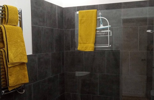 The downstairs living area is all open plan with a generously equipped kitchen, living room and dining room so very sociable and great for large groups to be together. The living room looks out over the swimming pool and open fields through 4m wide sliding doors that open completely and slide into the wall creating a seamless indoor/outdoor space.
