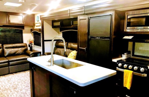 Tucked away for total privacy, the Happy Hideaway Glamper is spacious, with a nice KING bedroom (with a fireplace!), closet space and seating. Past that is the private bath with shower, with towels and all the shower goods provided. Then there's a large living area with another lovely fireplace, cushy seating (sofa makes into Queen bed if needed), and a (big!) island kitchen with dining. That kitchen is fully-stocked with everything you need, AND there's a grill outside in your courtyard, too.
