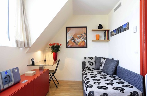 The studio is ideally situated and has exclusive standing. In an 18th century Haussmann building at the last floor with elevator. You enjoy full enlightenment and a nice view of the top of the Eiffel Tower. Heating and air conditioning that you can control internally. The studio feature A double sofa bad and one single bad. The kitchen is fully equipped with electric stove, Owen, microwave, fridge, toaster and boiler. All equipments are available and grocery shop is downstairs (as well as most famous Paris Epicier Lafayette Gourmant). The bathroom is well lightened with a large shower, wc and bide. Towels and bed sheets Q